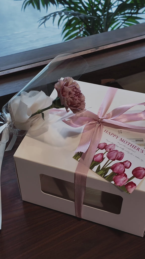 The cake comes with a bouquet of carnation, a Mother's Day topper and card, candles, and a cooler bag.